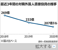 20年の外国人直接投資(FDI)は届け出ベースで前年比11.1%減の207億5000万ドル、実行ベースで17%減の110億9000万ドルだった。新型コロナウイルスの影響で世界的に投資が減少する中、韓国も例外ではなかった。国別では韓国との関係が悪化を続けている日本からの投資が急減し、前年(14億ドル)の半分の7億ドルにまで落ち込んだ。