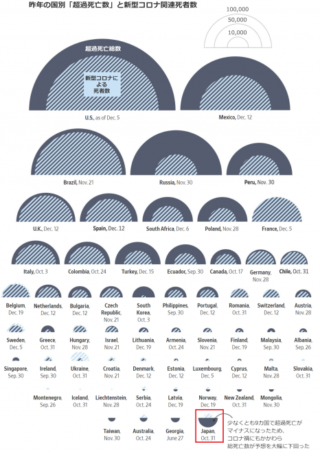 下の方に小さく書かれている国は超過死亡がマイナスの国。
