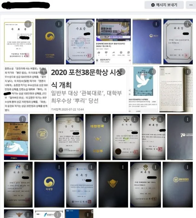 キム氏によると、ソン氏は『根』を最初から最後までそのまま盗用して「第16回沙渓・金長生文学賞新人賞」「2020フォーチュン38文学賞大学部最優秀賞」「第7回慶北日報文学大展佳作」「第2回グローリーシニア新春文芸当選」「季刊誌『小説美学』2021年新年号新人賞」という5つの賞をとった。