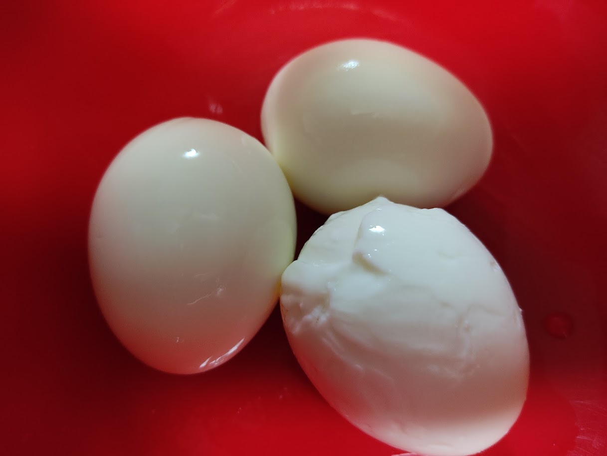 丸いほうにヒビを入れて茹でたけど1個ボロボロwたぶん1個が先週の残りで、2個が今日買った卵かも