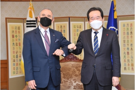 韓国の丁世均(チョン・セギュン)首相は18日、バイデン米政権の発足に合わせて離任するハリス駐韓米大使の表敬をソウル政府庁舎で受け、「この先も韓国の友人として韓米同盟の発展に関心と愛情を持ち続けてほしい」と話した。