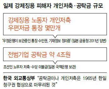日本植民地時代に強制徴用された被害者の未払い賃金の個人請求権が生きているという最高裁判決が出てきて、三菱など日本戦犯企業が徴用労働者の賃金を強制的に切り離し、銀行に預けた個人貯金を取り戻す道が開かれたのに政府は傍観だけしている。政府は、三菱などが日本敗戦後、日本政府に供託した朝鮮人軍人・労働者などの未払い賃金の6兆ウォンにも「1965年韓日請求権協定締結に既に終わったこと」との見方を繰り返している。