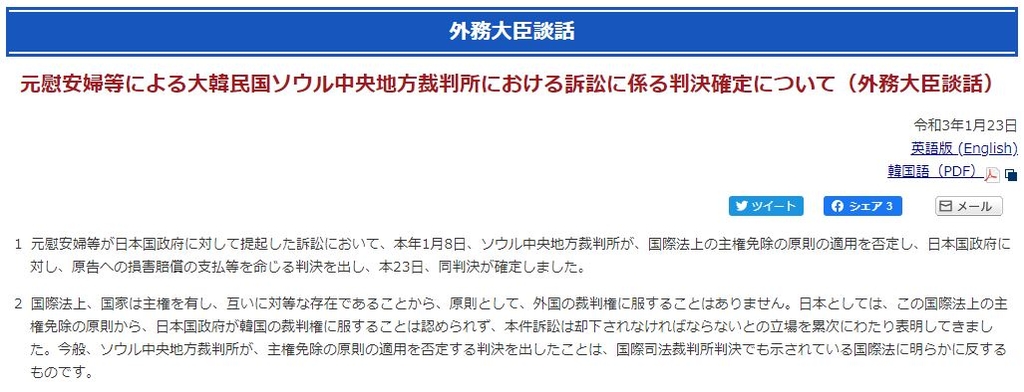 http://www.chosunonline.com/site/data/html_dir/2021/01/20/2021012080048.html>>76韓国政府は、慰安婦被害者に、日本政府が賠償するという韓国の裁判所の判決と関連して、政府レベルでは、日本についていかなる追加的な請求もしない方針だと明らかにしました。