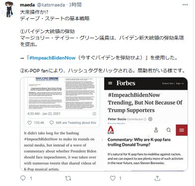 日本政府はコロナ対策で忙しい。文在寅政権は幼児ではないのだから、日本にウンコの後始末を期待するのは頭がおかしいとしか思えない。共和党議員の「#バイデンを今すぐ弾劾せよ」をK-POPファンがハイジャック。推しアーティストが次々投稿される