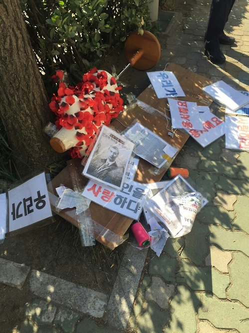 ハさんは「インターネットの記事を見てとても怒って一晩寝ていない」とし「1人デモを行う男性に会おうと来たが、なくて付着物をすべて剥がした」と述べた。