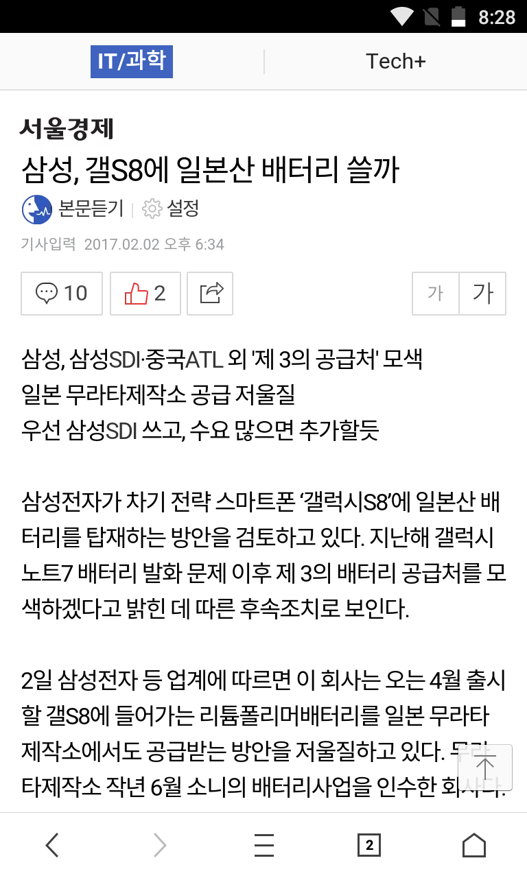 삼성전자가 차기 전략 스마트폰 ‘갤럭시S8’에 일본산 배터리를 탑재하는 방안을 검토하고 있다. 지난해 갤럭시노트7 배터리 발화 문제 이후 제 3의 배터리 공급처를 모색하겠다고 밝힌 데 따른 후속조치로 보인다.