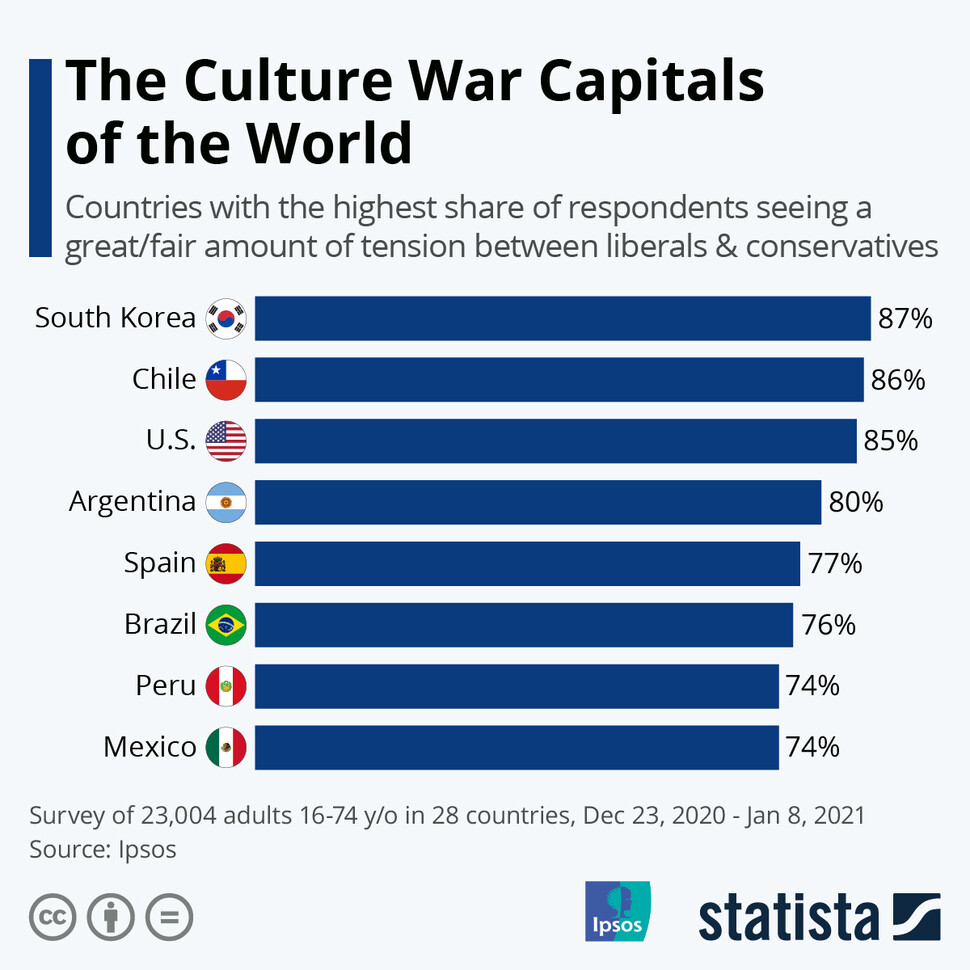 韓国(87%)、チリ(86%)、米国(85%)、社会的リベラルvs伝統的な価値観