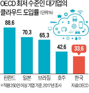 今年は世界で初めて次世代通信規格『5G』移動通信サービスとスマートフォンを商用化した」と紹介している。しかし「ビジネスITの領域になると話は違ってくる」とし、「従業員250人以上の韓国企業のクラウド導入率は33.6%に過ぎず、17年の統計によると経済協力開発機構(OECD)加盟20カ国中19位だ」と指摘している。(中略)