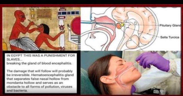 파충류가 인간의 코 내부의 깊숙한 뇌 부근에 베리칩 주입 그림,