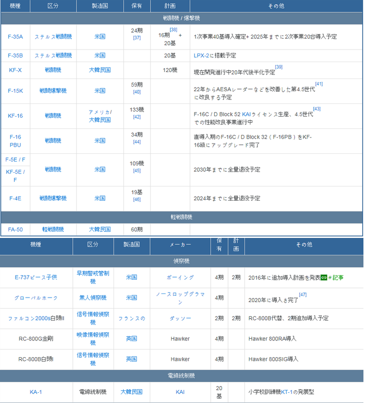 ・F-35A/B 80台、・KFX 120台、・F-15K 59台(EX改良)、・KF-16 132台(V型改良)