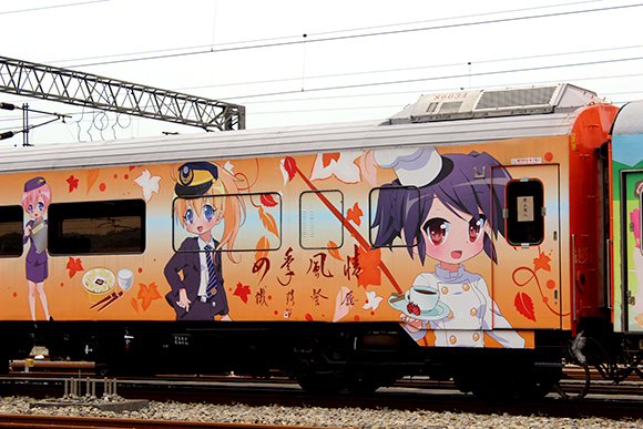 画像のオレンジ色の車両は食堂車で、台湾のキャラクターです。とは言っても、こうなると日本のアニメキャラに見えてしまいます。