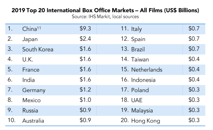 例えば2019年ハリウッド映画(アメリカ制作映画)国別売り上げランキング