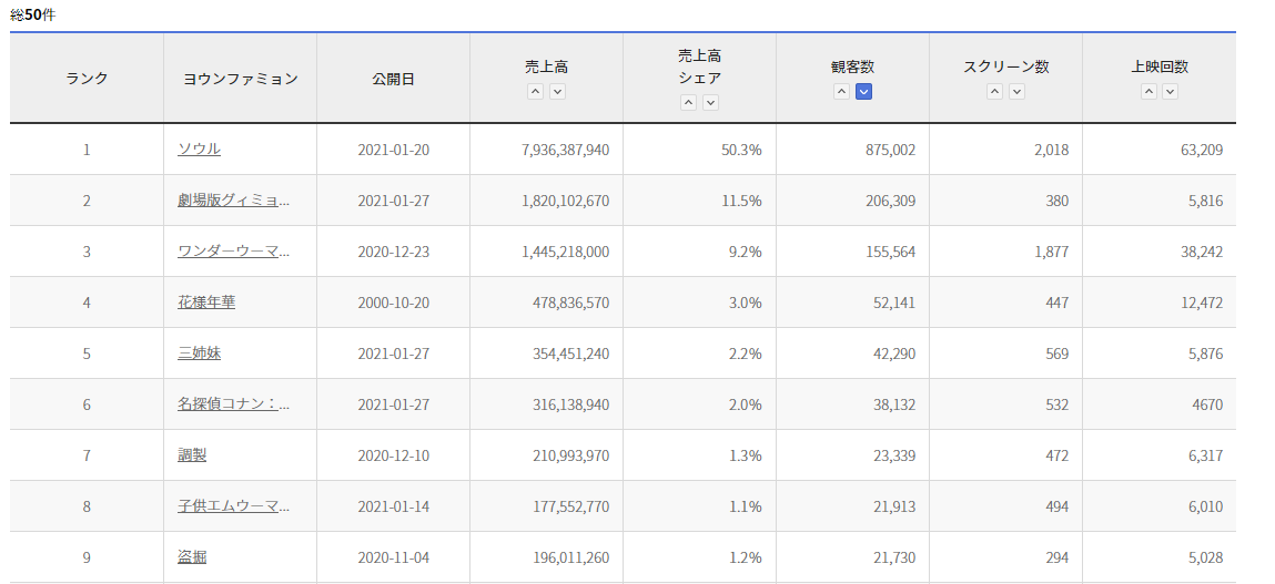 現在における韓国国内の映画入場ランキング、2位が日本映画の「鬼滅の刃」、6位が「名探偵コナン」だぞwww