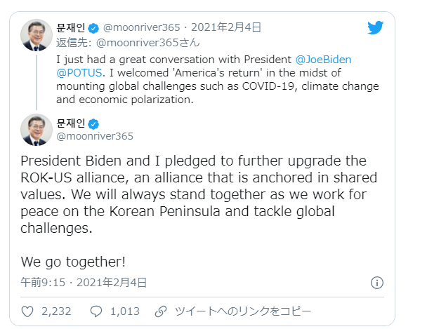 ジョー・バイデン氏の大統領就任から14日が経過した4日、韓米首脳電話会談が行われた。