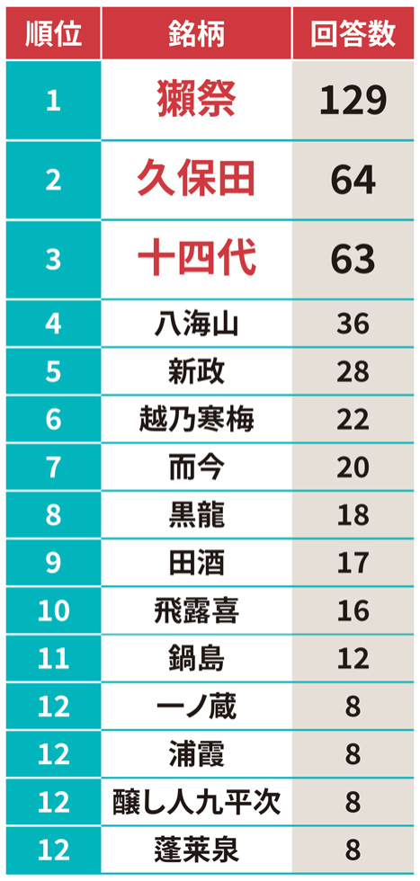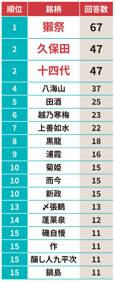 「接待で」の5位に入ったのは「新政」。日本酒の定義を大きく変えた気鋭のブランドで、ビジネスの場面でも、その革命の精神を共にしたいとの思いを表現するにふさわしい。一方、「一番おいしい」の5位には「田酒」が入った。明治創業の青森市内唯一の酒蔵、西田酒造店の地酒。昔ながらの伝統製法を守り、入手困難なことから幻の酒とも呼ばれる。そうした多様な使い方、飲み方、楽しみ方があるのが、まさに日本酒の魅力といえる。一応地元にも賞を取った酒蔵があるから、なるべすそれを飲むようにしてるわ