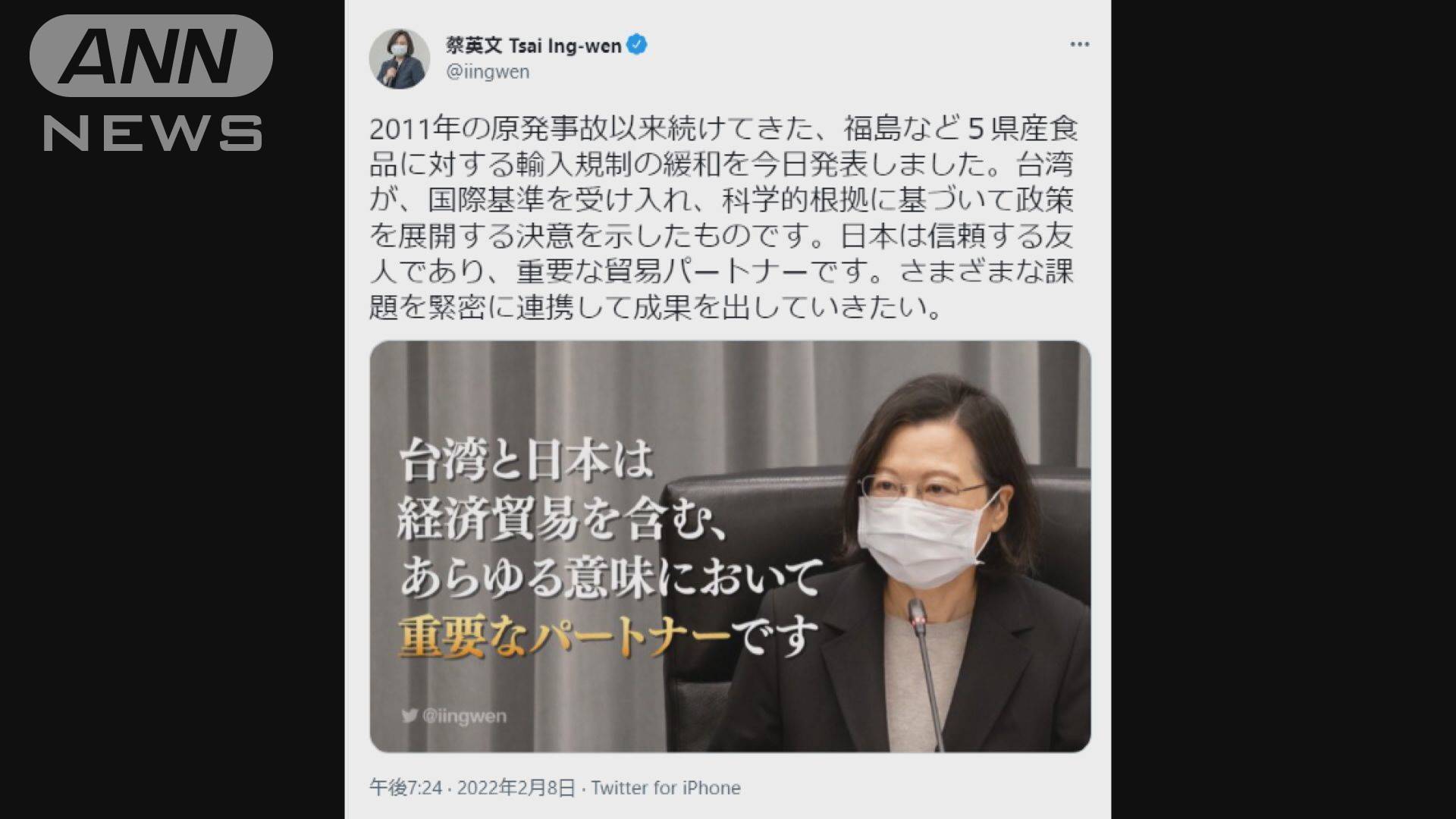 台湾の蔡英文総統は福島など日本の5つの県で生産された食品の輸入を再開することを受けて、SNSで「日本は重要な貿易パートナーです」と発信しました。