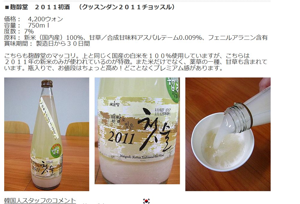 本格マッコリ(で普通の価格のは) 750ml 1,300ウォン(120円ぐらい)なのよね