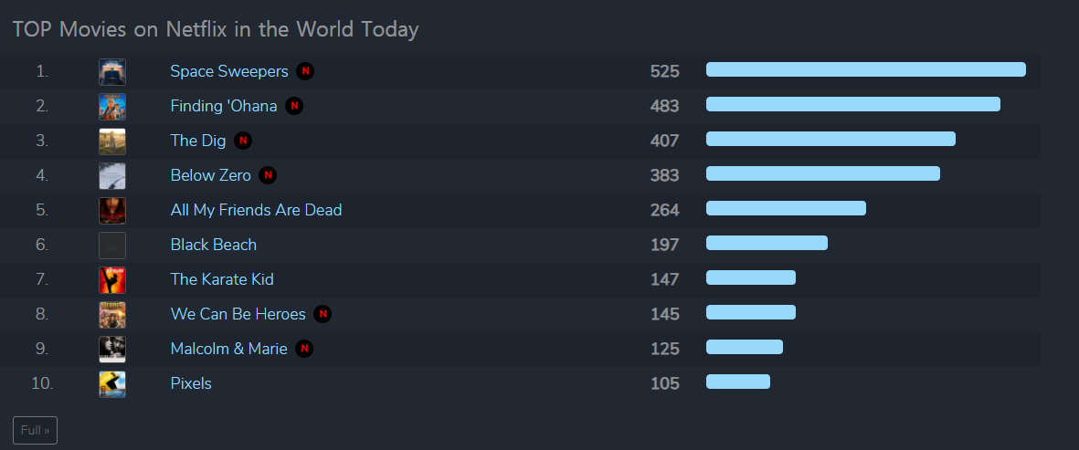 1名無し2021/02/07(Sun) 20:51:03ID:IzODIwMTI(1/3)NG報告한국 영화 Space Sweeper가 넷플릭스에서 공개되자마자 전세계 랭킹 1위를 했다출처 - Flixpatrol>>7>>30>>46>>48>>540