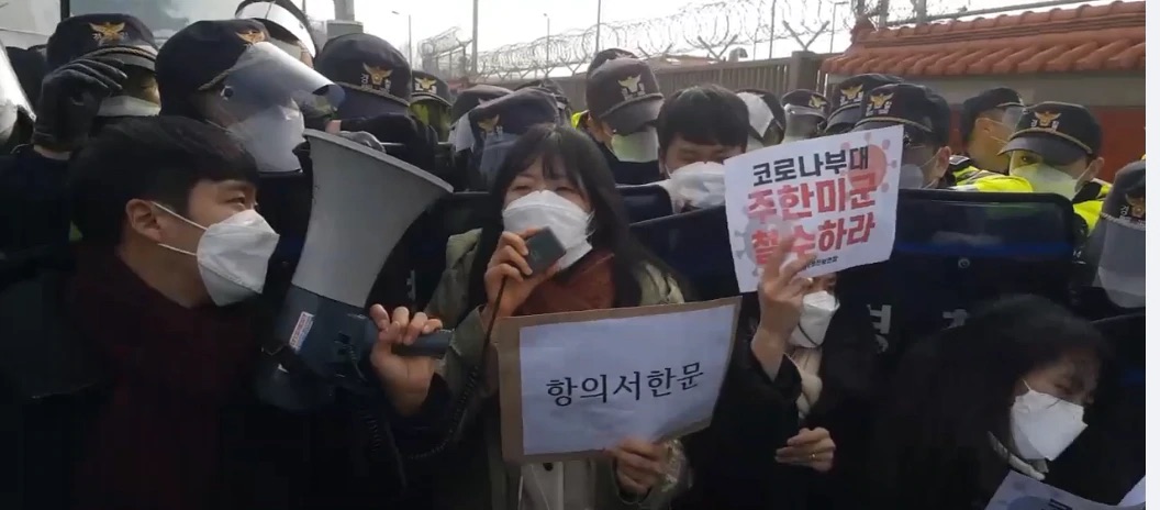 左派団体である韓国大学生進歩連合(対戦年)が6日、京畿道平沢の米軍基地前で「在韓米軍はコロナ部隊」と駐韓米軍撤収を促すデモを行った。これら拡声器を持って「在韓米軍がするだろラゴンやっと犯罪犯し、コロナ移しまき散らすだけ」とし「在韓米軍確定者が増えているがすぐに撤退すべきだ」とした。
