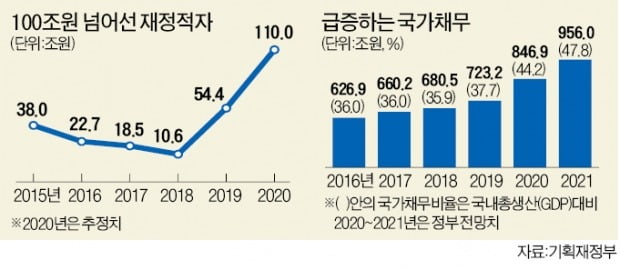 政府は昨年4回の追加補正予算を編成し、大規模な赤字国債を発行した。赤字国債の発行規模は18年の15兆ウォン、19年の34兆3000億ウォンと増えてきたが、昨年はさらに前年の3倍に急増した。