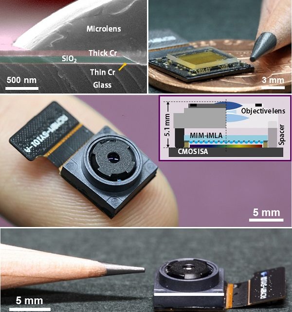 研究チームは、微細レンズ配列の光学的クロストーク現象を防止するために、厚さ200ナノメートル(nm)の金属-誘電体-金属の薄膜でできた光吸収層をレンズの間に配置し、対物レンズと微細レンズの間隔を一定水準まで縮めることで、超薄型ライトフィールドカメラの開発に成功した。高い光学的損失性と低い分散性を持つクロム(Cr)金属と高い透過率を持つガラス層をナノメートル水準の厚さで積層した構造(Cr-SiO2-Cr)は、可視光線領域の光を完全に吸収できる。このようなナノ光吸収層を微細レンズ配列の間に配置することで、光学的クロストーク現象を防止し、高コントラスト比、高解像度の3次元映像を獲得できる。