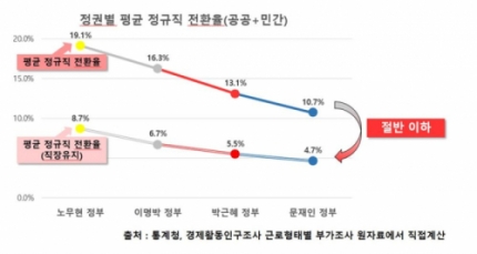 統計庁経済活動人口調査をもとに、歴代政権別の正社員への転換率を推計した結果、文在寅政府では全体正規職転換率と同じ職場内の正規職転換率ともに史上最安値を記録した。