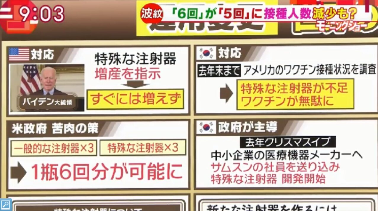 "후생노동성은 당초 화이자 백신 1병당 6회를 접종할 방침이었으나 국내에 있는 주사기로는 1병당 5회밖에 접종할 수 없다는 것을 뒤늦게 알게 됐다."