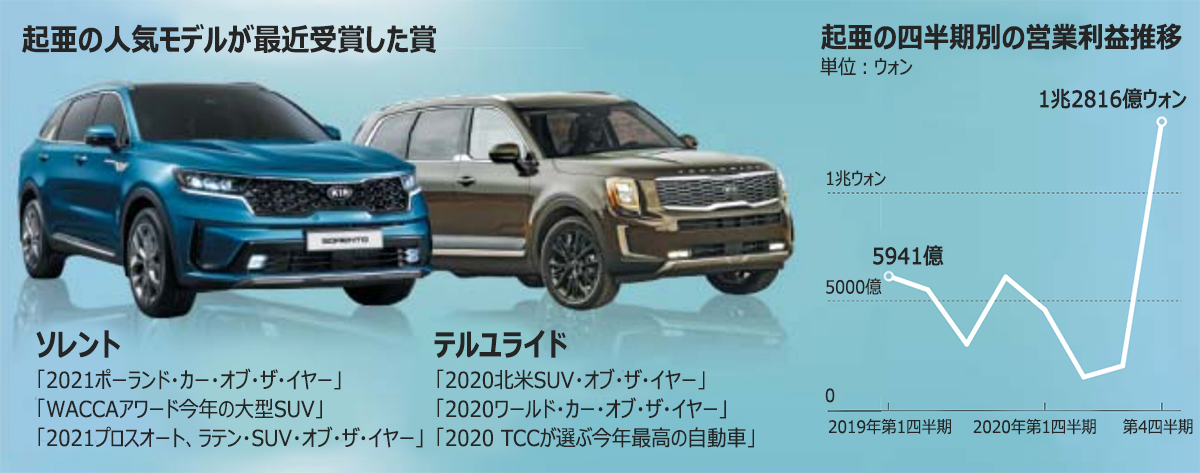 起亜は今年の実績がより期待されている。今年は四半期当たり1兆ウォン(約940億円)以上の営業利益を達成し、これまで成し遂げることができなかった「年間営業利益5兆ウォン(約4700億円)」の壁を越える可能性もある。海外では年明けからさまざまな自動車関連の賞を総なめしており、期待を膨らませている。