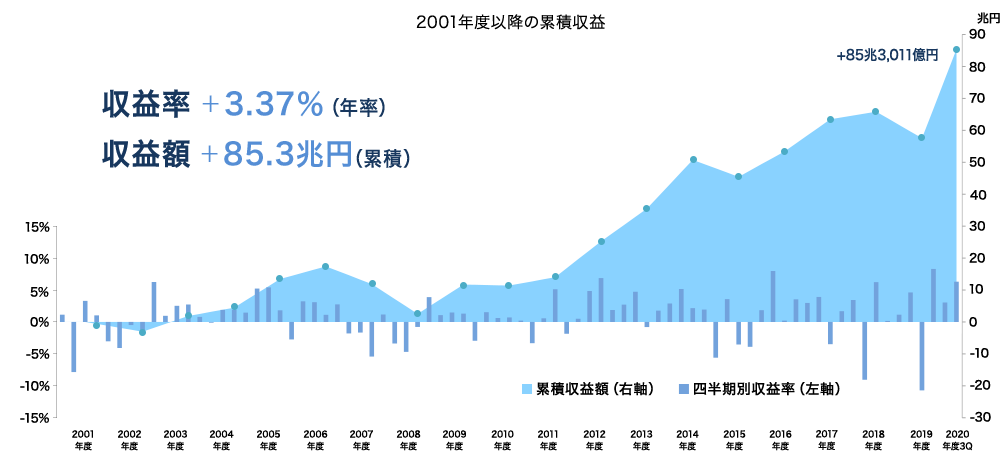 日本の場合、市場運用開始以来、2008年のリーマンショックの時期を含めても、平均収益率は年率+3.37%、累積収益額は+85.3兆円となっています。