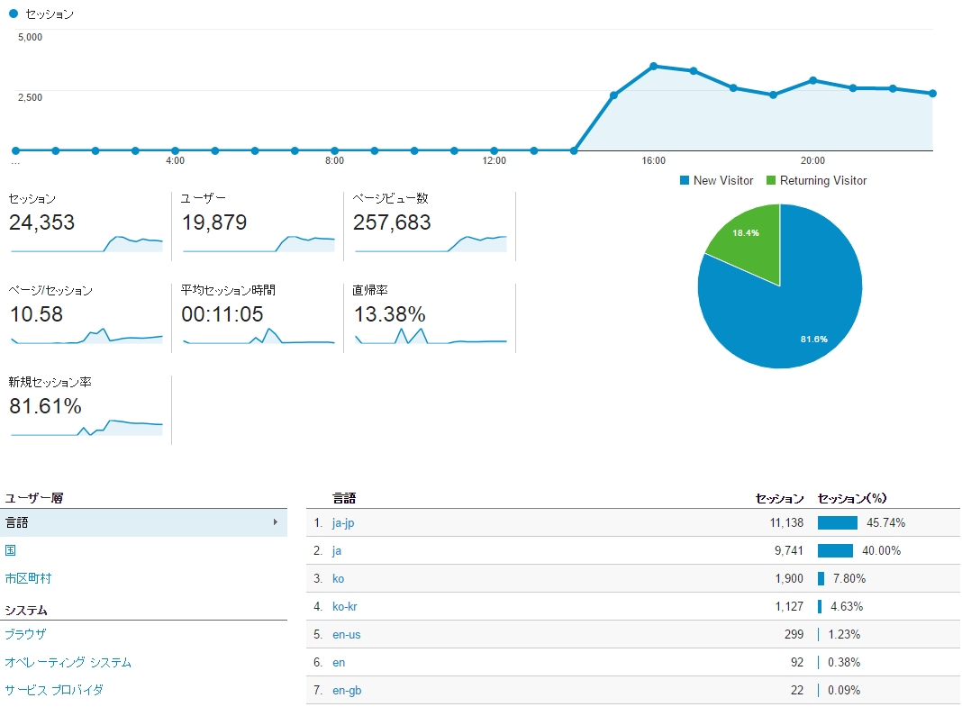 訪れたユーザーの言語を見ると、85%が日本で、15%が韓国という感じです。