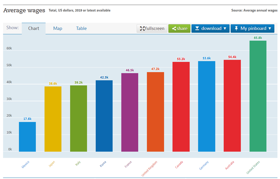 >平均賃金は、国民経済計算に基づく総賃金を経済全体の平均従業員数で割って計算。これに、フルタイムの従業員1人あたりの平均1週間の平均時間と通常1週間の平均時間の比率を掛け合わせる。 この指標は、2016年の基準年と同じ年の個人消費の購買力平価(PPP)を使用して、米国ドルに合わせて測定されている。