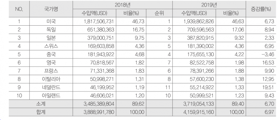 ★韓国の2018・2019年度の医療機器の輸入上位10カ国(出典:韓国の医療機器産業協会:画像①)