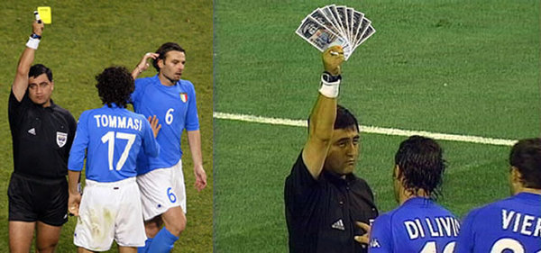 비에리의 경우에는 팔꿈치를 들어올리다가 실수로 부딪혔다고 변명할 여지가 있을 수 있겠지만, 토티가 김남일 선수를 팔꿈치로 공격한 반칙은 어떤가? 토티가 팔을 휘두르는 제스처가 있었기 때문에, 실수로 벌어졌다고 보기 어렵다. 현재 기준으로는 가차없이 퇴장 되었겠으나, 그 때 토티는 고작 옐로우 카드만 받았다.