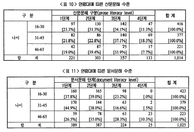 그 결과 한국의 젊은층은 산문문해에서는 노인층보다 우수하지만, 문서문해 능력에서는 오히려 노인보다 약한것으로 드러났습니다. (아래의 연령별로 한국인의 문해력을 분석한 도표 참고)