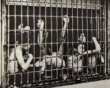 挿絵の一つは、10人以上の少年たちが裸でおりに閉じ込められ、鉄格子に寄りかかっている姿などを描いたもの。端島島民の会の調べによると、この挿絵は昭和52年出版の写真録「日本現代写真史 1945-1970」(平凡社)に収められた浮浪児の写真と構図が酷似している。21年に東京・品川で撮影され、「狩り込みで少年保護所に収容された浮浪児」との説明がある。