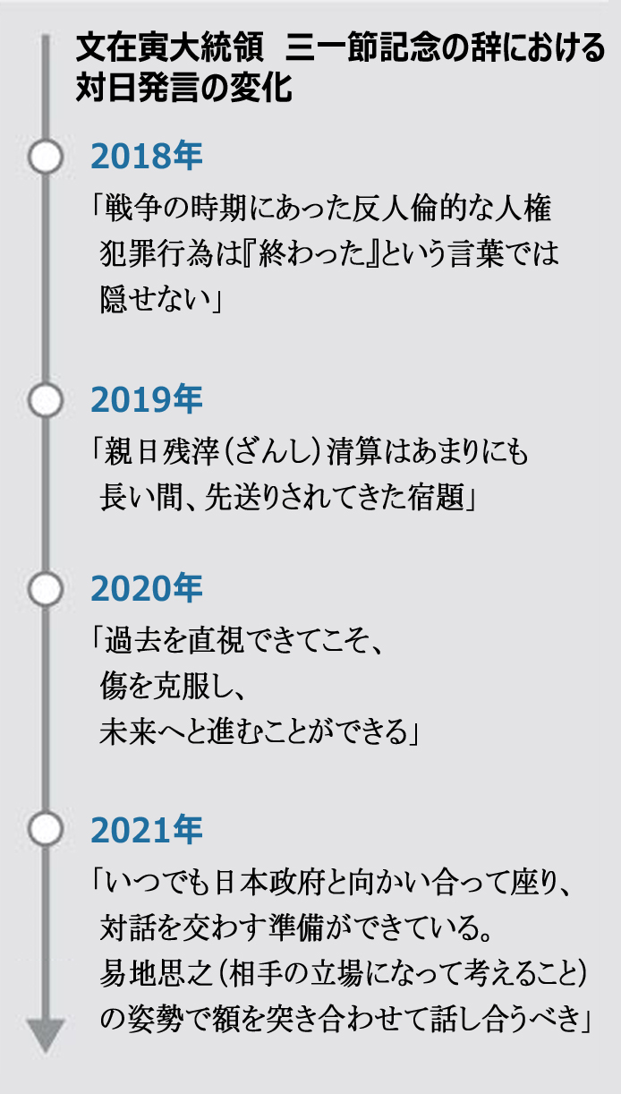 NHKは、文大統領が慰安婦問題などに直接言及しなかったが、外交で懸案の解決を目指すとする従来の立場を繰り返すにとどまったとし、「日米韓3か国の連携を重視する米バイデン政権を念頭に、日本側の協力を取りつけたい思惑があるとみられる」と分析した。