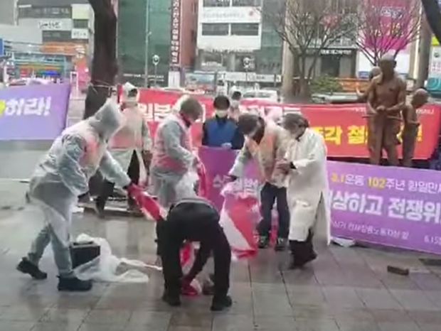 強制徴用労働者像の前で引き裂かれた旭日旗…「日本は植民地犯罪に謝罪して賠償しろ」