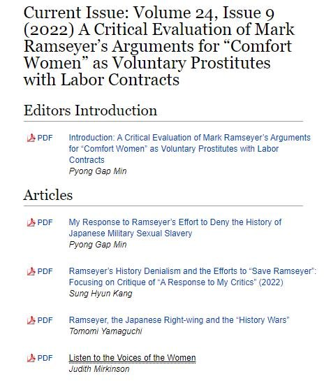 17日の聯合ニュースによると、ミン・ビョンガプ・ニューヨーク市立大クイーンズカレッジ教授など韓米の学者は最近、国際女性学ジャーナル(JIWS)に「慰安婦女性が自発的売春婦というマーク・ラムザイヤーの主張に対する批判的評価」と題した特別版を発行した。
