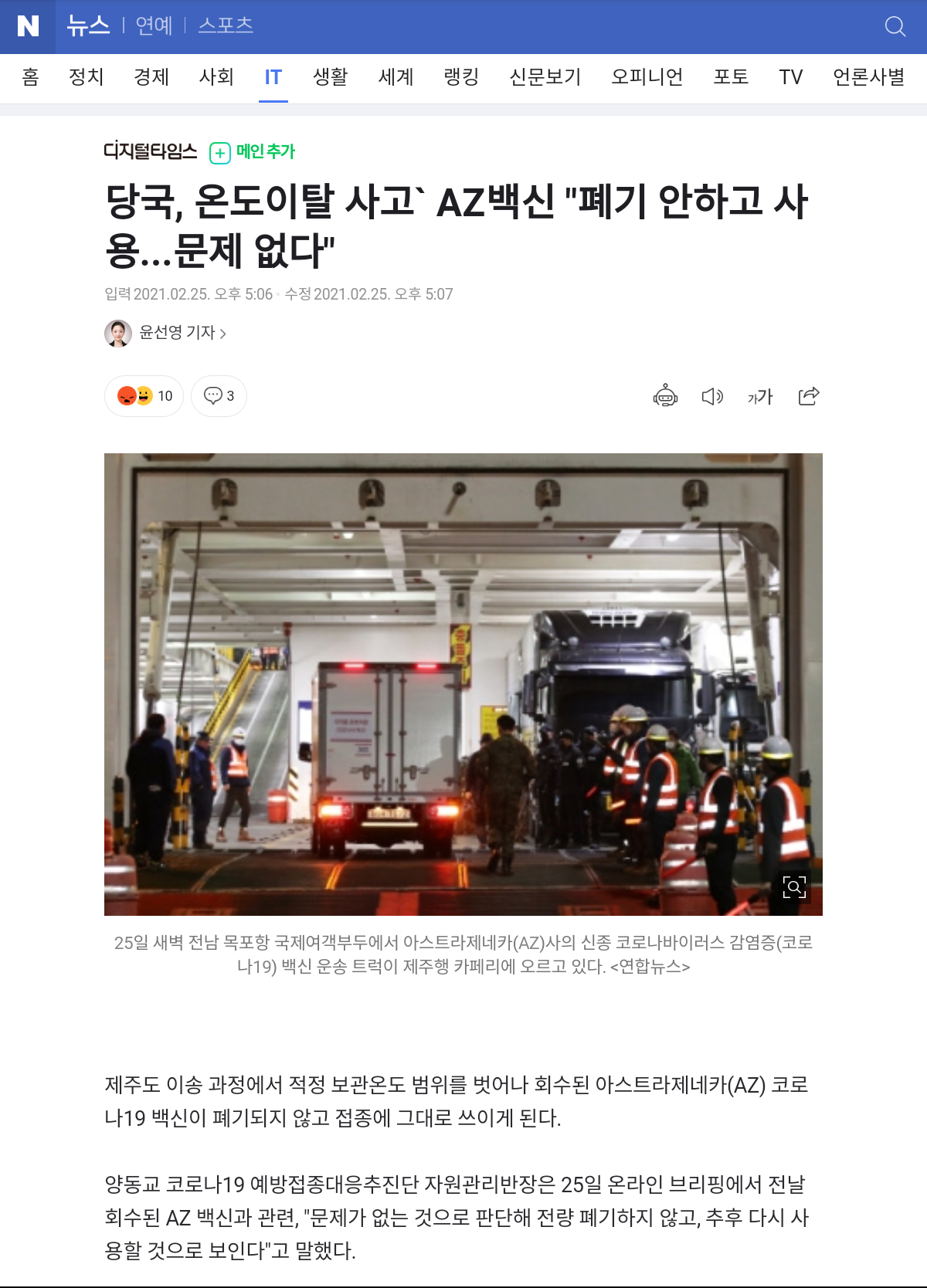 25日、病気管理庁などによると、前日の午後、済州道民に接種するワクチン3900回分の試合利川の物流センターで冷凍タプチャを介して出荷されたが、移送中適正温度範囲を超えて全量回収