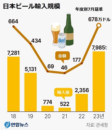 日本政府が2019年7月に韓国に対する輸出規制に踏み切ってから韓国内で広まった日本製品の不買運動の影響で、日本ビールの輸入は急減した。同年6月の9462トンから7月は5131トン、8月は245トン、9月は4トンにまで落ち込んだ。その後、輸入量は増減を繰り返し、昨年9月から増え続けている。