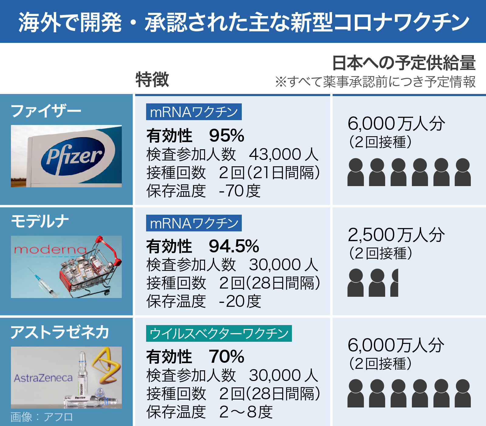 米ファイザー製の新型コロナウイルスのワクチンについて、6月末までに約1億回分(約5千万人分)を調達できるとの見通しを表明した。欧州連合(EU)の承認が得られれば、5月に毎週、最大約1千万回分が日本に到着し、6月は「5月を上回る供給」を見込む。4月中旬の医療従事者向け接種から1瓶当たり6回打てる特殊な注射器が使用可能とした。全高齢者約3600万人分を6月末までに市区町村に届ける方針も重ねて示した。