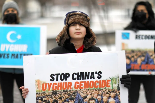 中国のウイグル族の扱いへの視線は、世界で厳しさを増している(2月、米ワシントン)=ロイター