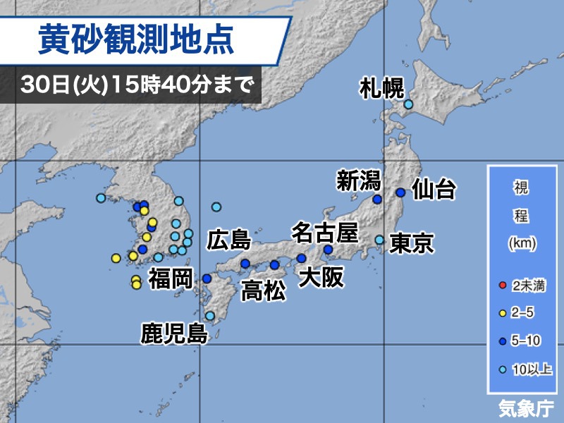 東日本で午前中に観測があったのは新潟のみでしたが、14時37分に東京で、58分に名古屋で黄砂が観測されました。気象庁が観測を発表しているほぼ全地点で、黄砂が観測されたことになります。
