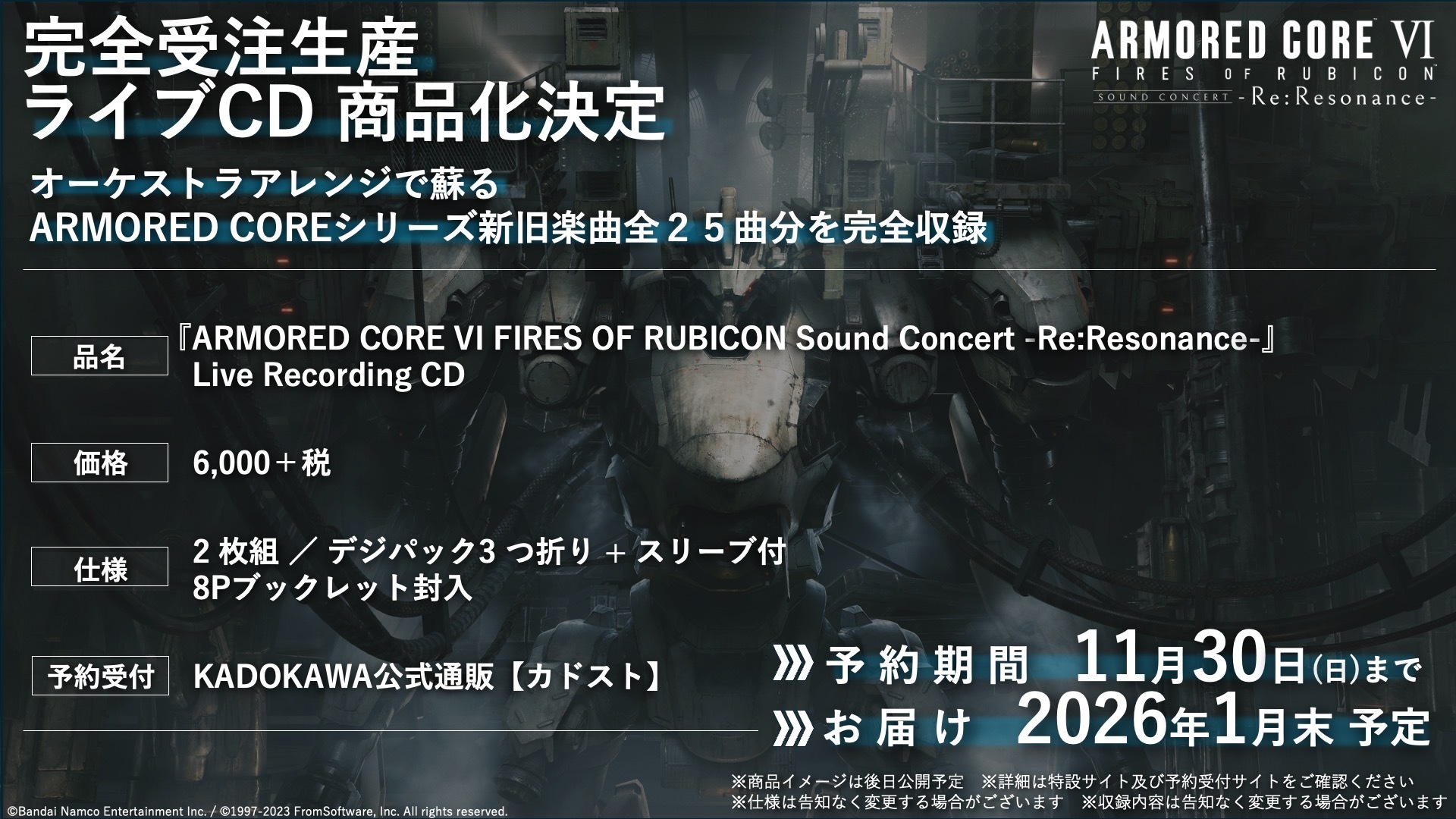 『ARMORED CORE VI FIRES OF RUBICON Sound Concert -Re:Resonance-』の東京公演のコンサート音源を収録したCD商品が完全受注生産で予約受付中。