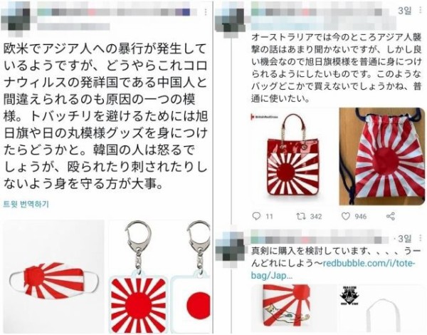 「コロナ19」でアジア人に対する嫌悪犯罪が増加し、日本の一部ネチズンが外国で旭日旗や日の丸商品を着用することを薦めている。 旭日旗、日の丸を所持することで日本人であることを明確にし、中国人と誤認され嫌悪犯罪の標的になるのを防止しようという論理だ。