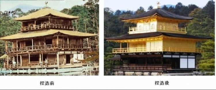 事件当時の寺関係者の回顧談等によると、焼失直前の旧金閣はほとんど金箔の剥げ落ちた簡素な風情で、現在のように金色に光る豪華なものではなかった。また修復の際に創建当時の古材を詳細に調査したところ金箔の痕跡が検出され、本来は外壁の全体が金で覆われていたとの有力な推論が得られたことから、再建にあたっては焼失直前の姿ではなく創建時の姿を再現するとの方針が採られた。