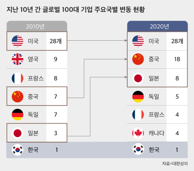 日本は5社増えたのに…過去10年間でグローバル100大企業に入った韓国企業は0社