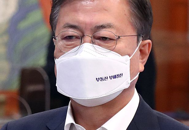 ムン・ジェイン大統領が29日午後、大統領府本館で開かれた第7回工程社会腐敗防止政策協議会に「不動産腐敗清算」というフレーズが印刷されたマスクを使って参加した。ドア大統領は、ソウル市江南区清潭洞アパート県テナントに昨年7月に賃貸借3法の施行二日前にチョンセ金を14.1%上げて受けた事実が明らかになったキム・サンジョ大統領府政策室長をこの日午前硬質た。
