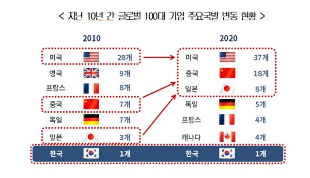 https://japanese.joins.com/JArticle/277208>韓国・米国・日本・中国のグローバル企業数、売上高、売上高比重の指標を分析した結果、韓国企業の競争力が大きく後退したことが分かった。