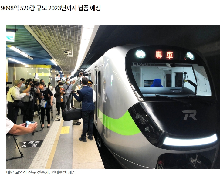 현대로템은 지난 2018년 대만 교외선 전동차 520량을 약 9098억 원에 수주하며 1999년에 수주한 철도청 전동차 56량 이후 19년 만에 대만 시장에 다시 진출했다.